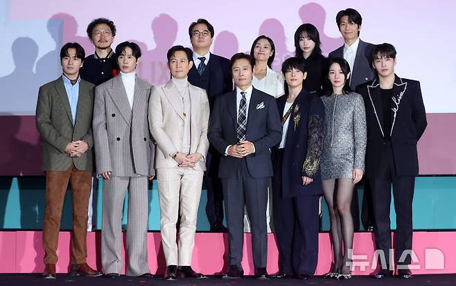 [서울=뉴시스] 김혜진 기자 = 배우 이진욱(왼쪽부터), 양동근, 박성훈, 이정재, 이서환, 이병헌, 강애심, 임시완, 조유리, 박규영, 위하준, 강하늘이 9일 오전 서울 중구 동대문디자인플라자(DDP)에서 열린 넷플릭스 시리즈 '오징어 게임' 시즌2 제작발표회에서 포즈를 취하고 있다.