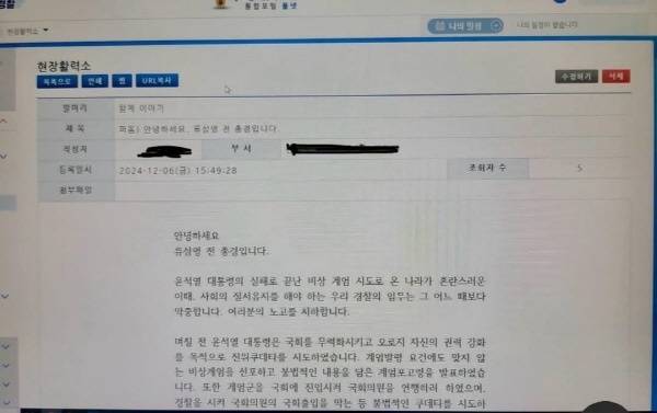 이어 "당시 국회 현장에 있었다. 경찰에게 '(막아서는 것을)풀어라'고 하니까 '상부의 지시'라 하기에 '상부의 지시에 따르면 죽는다' 고 했다. 하지만 현장에서 안 먹혔다"며 "현장에서는 말이 안 통하니까 경찰 내부망에 글을 적어 '이러면 내란의 공범이 될 수 있다'는 경격심을 주기 위해 글을 올렸다"고 말했다.