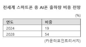 실제 애플은 지난 10월 애플 인텔리전스 기능이 포함된 운영체제인 iOS 18.1을 배포한 가운데 내년 4월 한국어 지원 버전을 출시하는 등 AI폰 주도권 경쟁에서 밀리지 않겠다는 의지를 내비치고 있다. 카운터포인트리서치에 따르면 올해 생성형 AI 스마트폰 출하량 비중은 19%에서 2028년 54%로 확대될 것으로 전망돼 AI폰 주도권 경쟁은 한층 치열해질 것으로 관측된다.