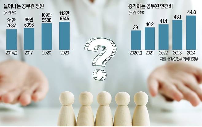경제 규모 확대와 사회 변화에 따라 정부가 해야 할 일이 많아지는 측면도 있다. 하지만 공공 부문 확대는 국민 경제에 큰 부담을 준다. 우선 공무원 인건비가 모두 세금이다. 코로나19 여파로 경제성장률이 -0.7%로 떨어진 2020년에도 공무원 인건비 총액은 전년 대비 5.1% 증가했다. 올해 공무원 연금 적자를 메우기 위한 정부 보전금이 8조6000억원, 국민 1인당 17만원이다. 미래에 공무원 연금을 지급하기 위해 적립해둔 충당부채가 작년 말 기준 985조원에 이른다.