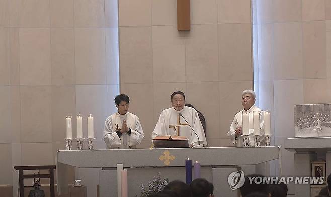 (대전=연합뉴스) 천주교 대전교구가 9일 오후 7시께 대전 중구 대흥동성당에서 연 시국미사에서 김용태 마태오 신부가 미사를 접전하고 있다. 비상계엄 사태 이후 이날 대전에서 처음 열린 시국미사에는 대전교구 사제 100여명과 신자 등 1천여명이 모였다. 2024.12.9 [천주교 대전교구 제공. 재판매 및 DB 금지]