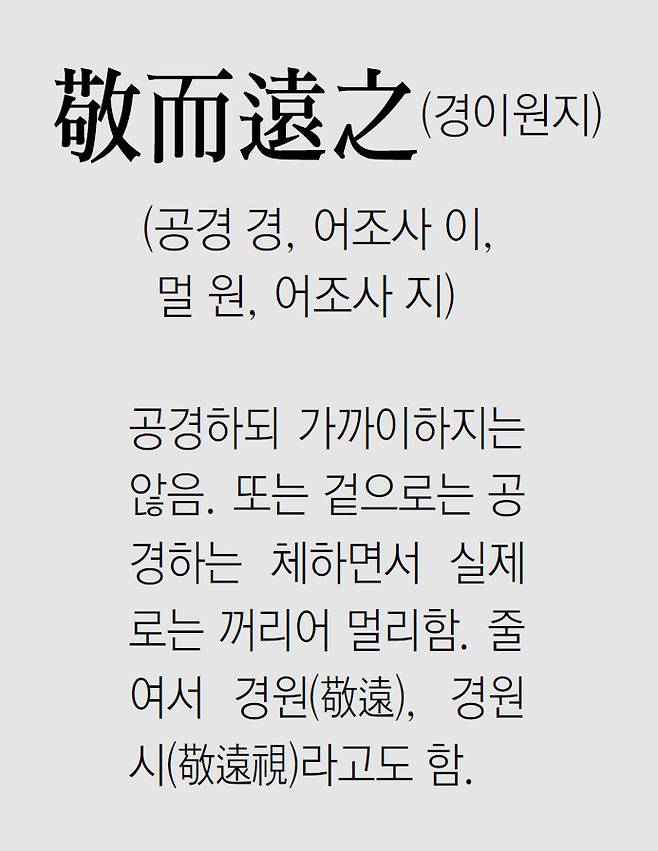 공자의 말에서 유래한 경이원지는 훗날 겉으로는 공경하는 체하면서 속으로는 꺼리어 멀리한다는 의미로 정착됐습니다.