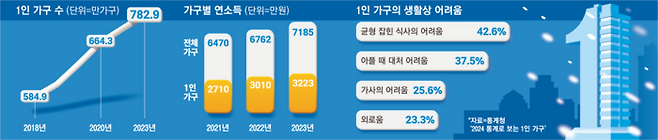 9일 통계청이 발간한 ‘2024 통계로 보는 1인 가구’에 따르면 지난해 1인 가구는 전체 가구 중 35.5%에 해당하는 약 782만9000가구로 사상 최고치를 기록했다. 1인 가구 비중은 2018년 29.3%, 2020년 31.7%, 2022년 34.5%로 꾸준히 확대되는 추세다.
