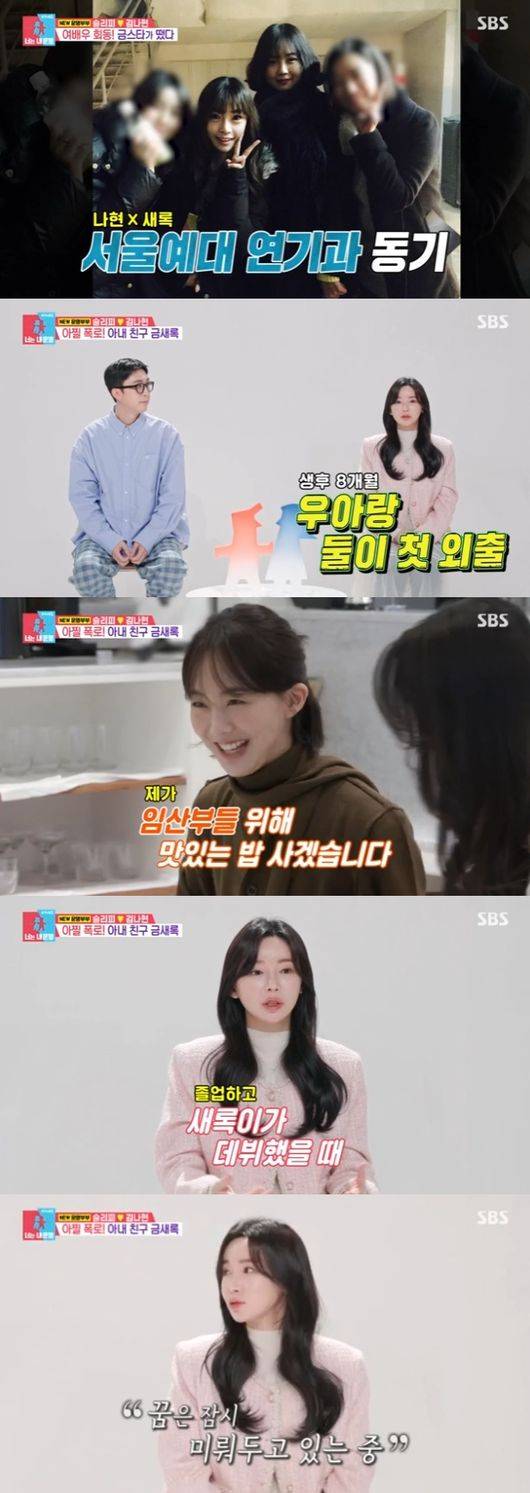 그런가 하면 다른날 슬리피는 '6시 내고향' 촬영을 위해 새벽 2시에 일어나 외출했다. 김나현 역시 같은 시간에 일어나 슬리피를 깨우고 도시락을 싸주는 등 살뜰히 내조하는 모습을 보였다. 슬리피가 없는 사이 육아, 집안일까지 마친 김나현은 친구를 만나러 외출했다. 그 곳에는 배우 금새록이 있어 눈길을 끌었다. 알고보니 서울예대 연기과 동기들의 모임이었던 것.