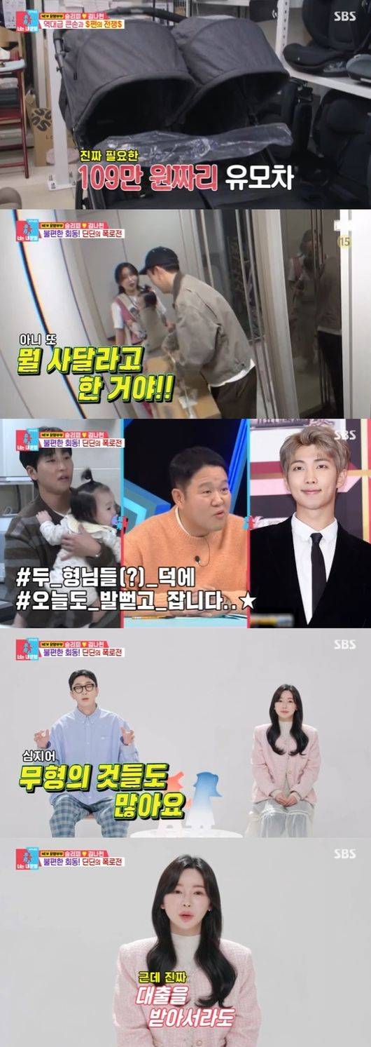 딘딘은 258만원짜리 유모차를 보는 슬리피에게 "비싼거 살필요 없다. 기억못한다. 그리고 중간에 당근해서 형이 이돈 먹을거잖아. 뭐하러 사냐고"라고 타박했고, 슬리피는 "인스타 같은데 올리려면 사야한다"며 "가난을 물려줄순 없다"고 고집을 피웠다. 이어 109만원짜리 2인용 유모차를 보고는 "이런거 잘나가지 않나. 실용성 있을것 같다"고 말했다.