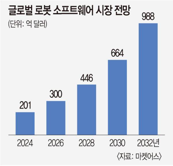 9일 시장조사기관 마켓어스에 따르면 글로벌 로봇 소프트웨어 시장은 올해 201억 달러(약 28조원)에서 2032년 988억 달러(약 141조원)로 커질 전망이다. 시장에서는 하드웨어가 아닌 소프트웨어로 로봇 산업의 패러다임이 바뀔 것이라는 전망이 잇따르고 있다. 로봇은 자신이 학습한 결과를 클라우드에 공유하고 업데이트하면서 더 똑똑해질 수 있는데, 이를 가능케 하는 것이 소프트웨어 역량이기 때문이다.