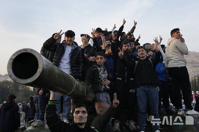 [다마스쿠스=AP/뉴시스] 9일(현지시각) 시리아 다마스쿠스에서 시민들이 거리에 버려진 시리아 정부군 전차에 올라가 바샤르 알아사드 정권의 붕괴를 축하하고 있다. 2024.12.10.
