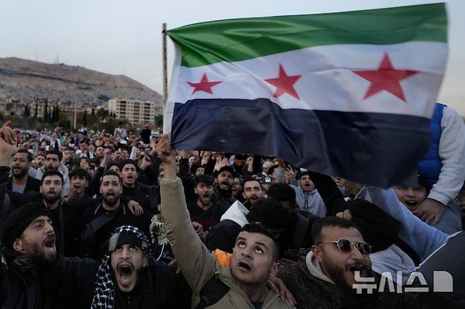 [다마스쿠스=AP/뉴시스] 반군이 수도를 장악한 지 이틀째인 9일(현지시각) 다마스쿠스에서 시민들이 혁명기를 흔들며 바샤르 알아사드 정권 붕괴에 환호하고 있다. 2024.12.10.
