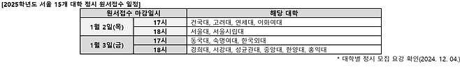 2025학년도 일반 대학의 정시 원서 접수는 12월31일부터 2025년 1월3일까지다. 대부분의 대학은 이 기간에 원서를 접수하지만, 일부 대학은 기간 내 3일 또는 4일만 접수를 한다. 특히 중요한 건 ‘마감 기한’이다. 진학사는 “정시에 지원하는 학생들은 대체로 원서 접수 기간 후반부에 접수하는데, 대학마다 마감 일시가 다르기 때문에 주의가 필요하다”고 강조했다.