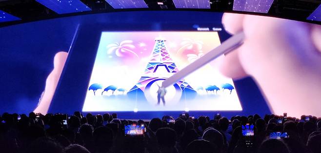 [지난 7월 프랑스 파리 루브르 박물관에서 열린 갤럭시 언팩 2024에서 아니카 비존 영국 법인 MX사업부 마케팅 부문 디렉터가 카메라 및 사진 AI 기능에 대해 설명하고 있다. (파리=연합뉴스)]