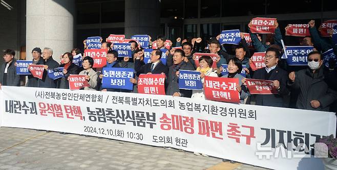 [전주=뉴시스] 김얼 기자 = 전북농업인단체연합회 관계자들과 전북특별자치도의회 농업복지환경위원회 의원들이 10일 전북 전주시 전북특별자치도의회 앞에서 '내란수괴 윤석열 탄핵 및 농림축산식품부 송미령 파면 촉구' 기자회견을 열고 구호를 외치고 있다. 2024.12.10. pmkeul@newsis.com