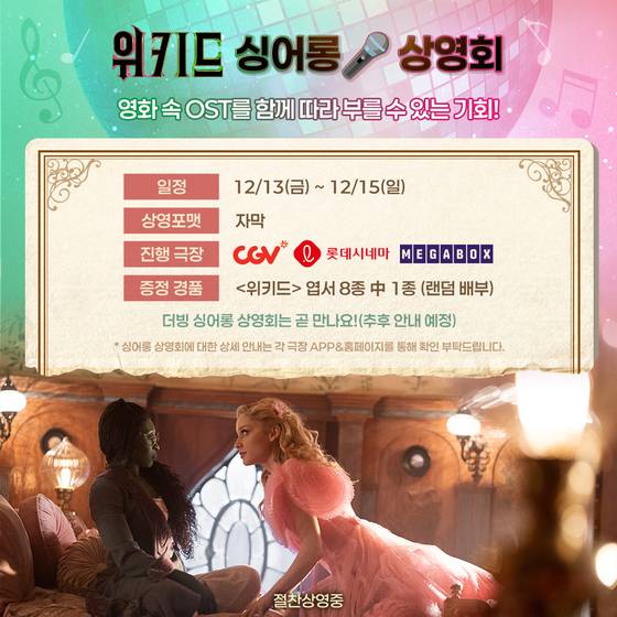 '위키드'는 오는 13일부터 15일까지 3일 간 전국 100여개 극장에서 싱어롱 상영회를 연다. 이번 상영회는 명곡 파티 '위키드'를 향한 관객들의 싱어롱관 상영 문의가 쇄도하면서 추진 된 이벤트로 기대를 더한다.