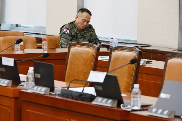 이상현 제1공수특전여단장이 국회에서 열린 국방위원회 전체회의에 출석해 김현태 특전사 707특수임무단장의 답변을 듣고 있다.
