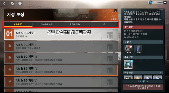 AR(돌격소총), SG(산탄총), SMG(기관단총), MG(기관총), RF(저격소총), BLD(도검), HG(권총)