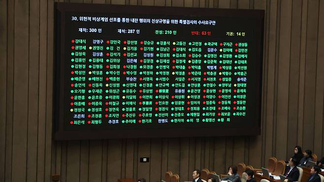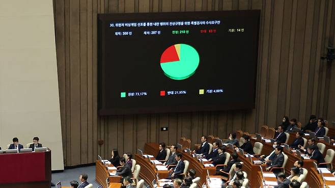 ▲ 10일 오후 국회 본회의에서 '위헌적 비상계엄 선포를 통한 내란 행위의 진상규명을 위한 특별검사의 수사요구안'이 통과되고 있다.