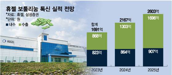 증권업계는 내년 휴젤의 보툴리눔 톡신 수출실적이 약 1700억원으로 올해(1300억원) 대비 30.2% 증가할 것으로 보고 있다. 전체 톡신 실적(2024년 2167억원→2025년 2603억원) 성장폭 전망치 20.1% 대비 10%포인트 이상 높은 수치다.