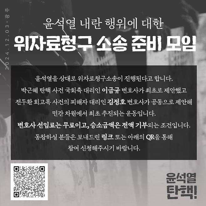 12·3 내란사태로 공포와 불안에 떨었던 국민들이 내란죄 피의자 윤석열 대통령을 상대로 정신적 손해배상 소송을 제기한다.