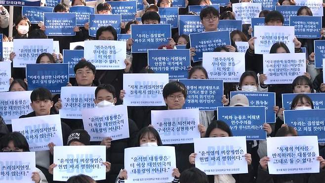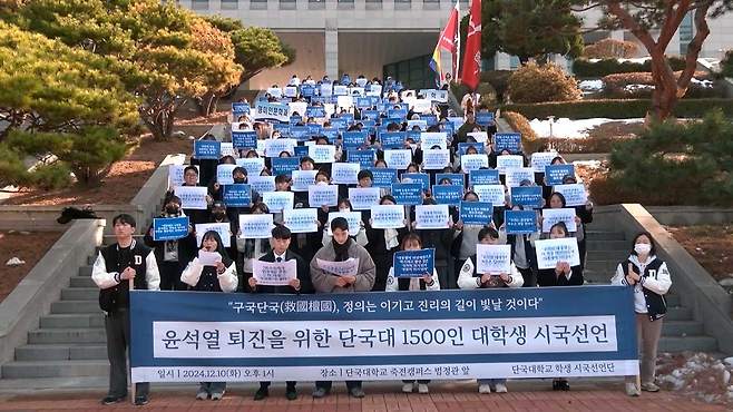 단국대 학생 150여 명은 오늘 오후 단국대 죽전캠퍼스에서 "법치국가에서 윤 대통령은 헌법 위에 군림하려 하고 있다"며 "구국 단국의 이념을 실천하기 위해 윤 대통령이 퇴진하는 그날까지 행동할 것"이라고 밝혔습니다.