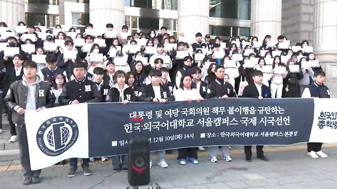 한국외국어대학교 학생들이 '비상계엄'을 선언한 윤석열 대통령과 윤 대통령 탄핵소추안 표결에 참여하지 않은 국회의원을 규탄하는 시국선언을 했습니다.