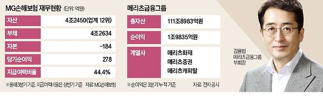 자산부채이전(P&A) 방식을 통한 인수가 가능한 것도 메리츠화재가 참전한 배경으로 꼽힌다. P&A 방식은 인수 대상 기업의 자산과 부채 중 일부만 선별적으로 인수할 수 있다. M&A와 달리 고용승계 의무가 없다. 메리츠화재는 대표적 건전성 지표인 지급여력비율(K-ICS·킥스)이 226.9%로, 금융당국 권고치(150%)를 훨씬 웃돈다. MG손해보험(킥스 44.4%)의 부실자산을 흡수할 여력이 충분하다는 평가다. 여기에 예금보험공사로부터 약 5000억원의 자금을 지원받을 수 있다.