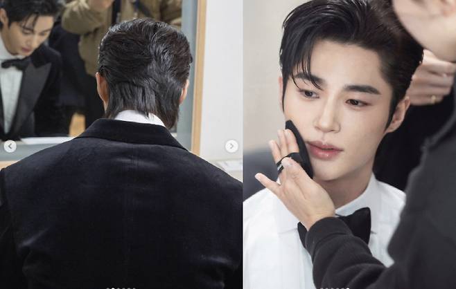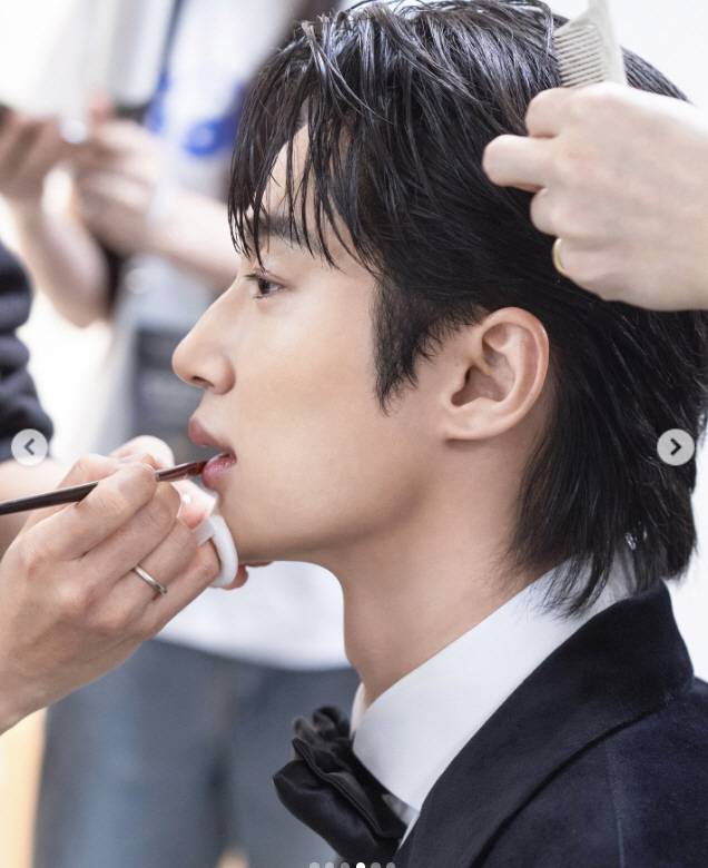 검은색 턱시도에 정갈한 리본 넥타이를 찬 변우석은 태평양 같은 어깨와 조막만한 얼굴로 메이크업을 받는 모습도 담겼다.