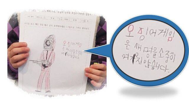 김영만(50) 바움교회 목사는 이 그림을 보여주며 “만19세 이상 관람가인 ‘오징어게임’을 봐서 등장인물과 배우 이름까지 꿰뚫고 있었던 아이였다”며 “그런 아이가 우리 교회 성교육캠프 때 아버지 손을 잡고 와 ‘생명의 소중함’이라는 ‘성품교육’을 한 시간 듣고 나서는 이렇게 피드백을 적어냈다”고 설명했다.