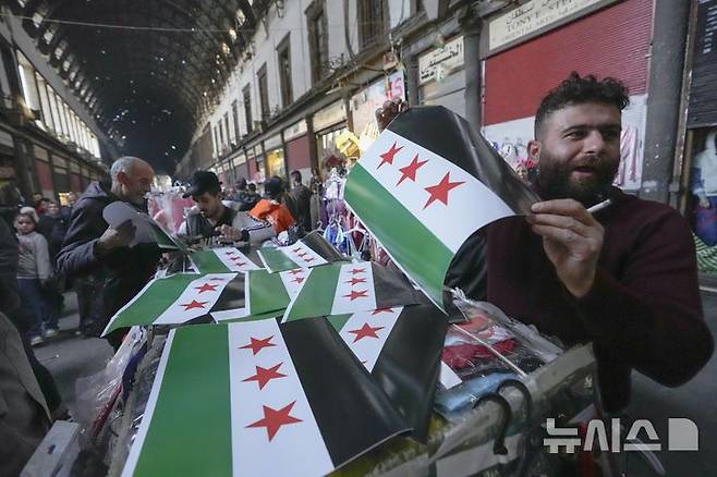 [다마스쿠스=AP/뉴시스] 10일(현지시각) 시리아 다마스쿠스의 구시가지 알하미디에 시장에서 한 상인이 반군 깃발을 판매하고 있다. 2024.12.11.