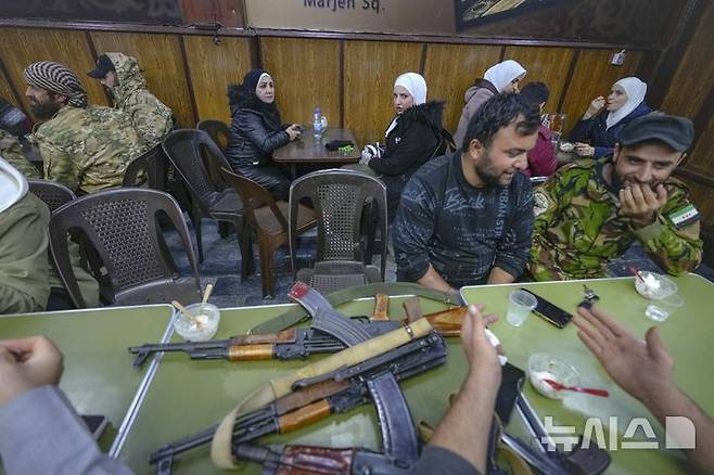 [다마스쿠스=AP/뉴시스] 10일(현지시각) 시리아 다마스쿠스의 구시가지 알하미디에 시장 내 한 식당에서 반군 전투원들이 아이스크림을 먹으며 얘기를 나누고 있다. 2024.12.11.