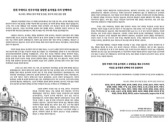 | ▲ 옥스퍼드 대학교 학생 및 동문, 연구자 53명의 성명서 "친위 쿠데타 주범 윤석열과 그 공범들을 체포 구속하라. 여당은 윤석열의 탄핵에 즉각 동참하라." |