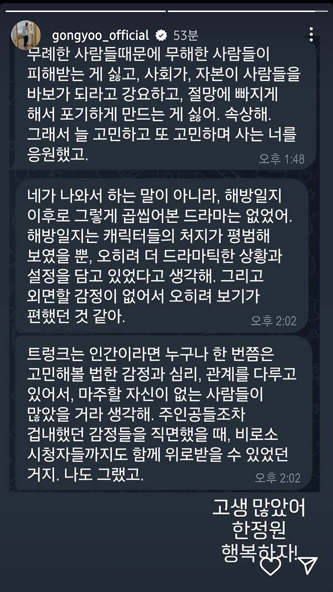 여기에서 멈추지 않았다. 공유는 개인 계정을 통해 '트렁크' 혹평에 맞서는 호평을 담은 지인의 메시지를 공개하면서 스스로 방어 기제가 되는 굴욕을 보이기도 했다. 대중의 혹평을 받아들이지 못하고 '발끈'하며 낯부끄러운 '셀프 찬사'를 아끼지 않은 공유의 태도에 팬들도 실망감을 감추지 못했다. 무해함을 증명하려다 되려 무례해진 공유의 소심함이 실소를 터지게 만들었다.