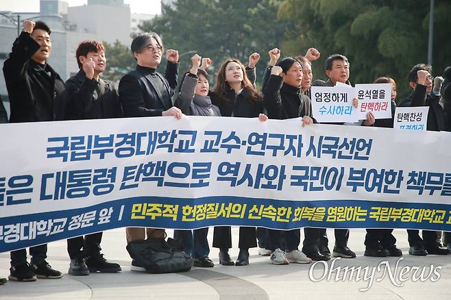 이날 오전 11시가 되자 국립부경대학교 정문 앞에서 갑자기 부산지역의 여당 국회의원 이름이 하나둘 불리기 시작했다. 바로 "국민과 역사 앞에 죄짓지 말라. 부산 국회의원들을 강력히 규탄한다"라는 구호가 뒤따라 나왔다. 이날 부경대 교수·연구자 212명은 윤 대통령의 탄핵을 촉구하는 기자회견을 개최했다.