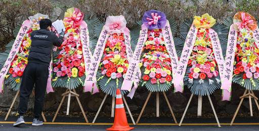 11일 오후 12시 기준 서울 용산구 대통령실·국방부 청사 앞에는 윤 대통령을 지지하는 화환 40여개가 줄지어 놓여졌다.