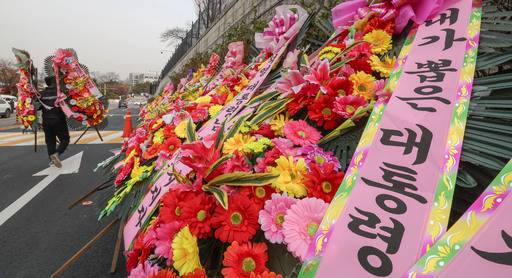 윤석열 대통령이 비상계엄 선포로 내란죄 혐의 피의자가 된 가운데 윤 대통령을 지지하는 화환이 대통령실에 앞에 배달돼 눈길을 끌고 있다.