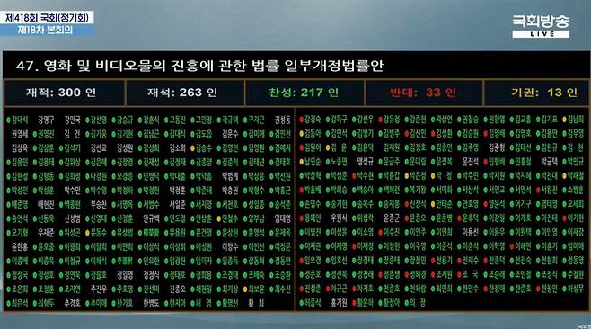 하지만 영화계 안팎의 이런 요구에도 불구하고 민주당은 결과적으로 폐지를 막겠다는 약속을 지키지 못했다. 이날 상속세 및 증여세법 개정안과 소득세법 개정안이 민주당의 반대로 부결된 것과 비교하면 대조적이다.