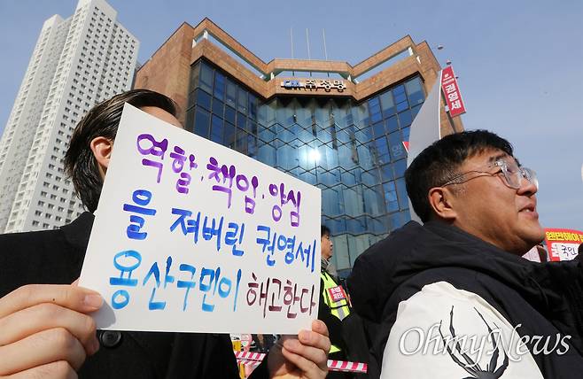 용산촛불행동, 용산시민연대, 윤석열 체포단, 이태원시민행동, 더불어민주당 용산구 지역위원회, 조국혁신당 서울시당, 진보당 용산 마루분회, 정의당 용산구 지역위원회, 국민주권당 서울시당, 소나무당 서울시당 주최로 11일 오후 서울 용산구 국민의힘 권영세 의원 사무소 앞에서 '국민의힘 해체! 권영세 사퇴! 기자회견'이 열리고 있다.