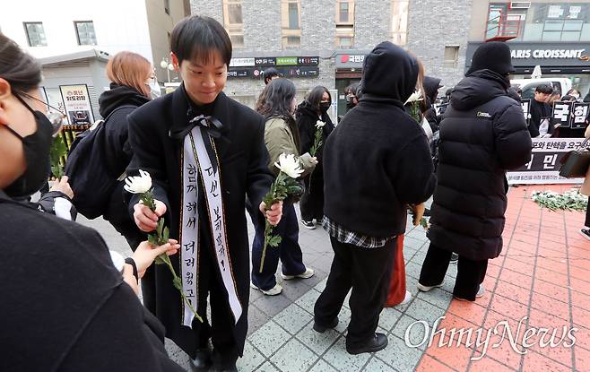 위아래 검은 옷을 맞춰 입은 청년들은 하나씩 집어 든 하얀색 국화를 국민의힘 당사 앞 땅바닥에 내던지며 "너희들은 책임 행사도 안 하지만 우리는 꽃이라도 줄게"하고 깔깔깔 웃었다.