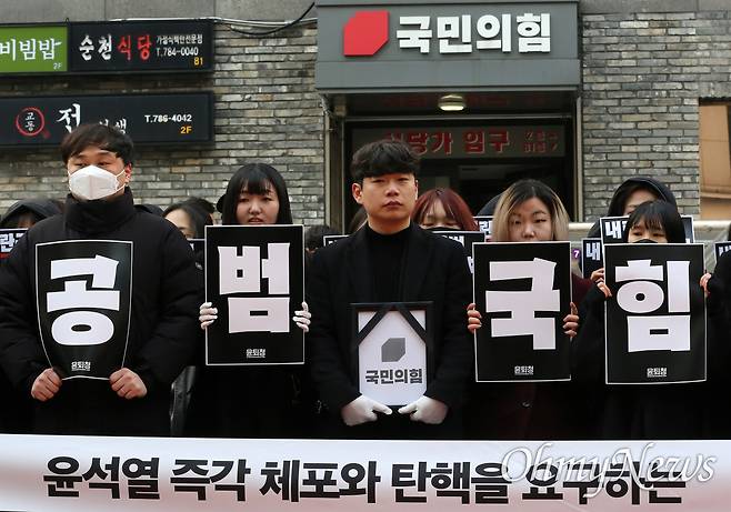 | ▲ 윤석열 퇴진을 위해 행동하는 청년들 주최로 11일 오전 서울 영등포구 국민의힘 당사 앞에서 열린 '국민의힘 장례식'이 열리고 있다. |