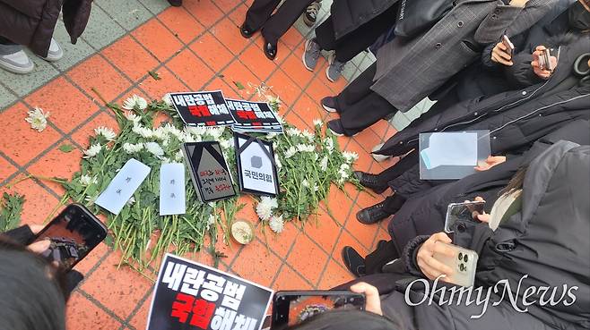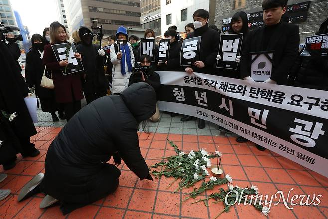 11일 오전 서울 여의도 국민의힘 당사 앞에 모인 20대 청년 100여 명이 "액션빔" 소리에 맞춰 환호성을 질렀다. 위아래 검은 옷을 맞춰 입은 청년들은 하나씩 집어 든 하얀색 국화를 국민의힘 당사 앞 땅바닥에 내던지며 "너희들은 책임 행사도 안 하지만 우리는 꽃이라도 줄게"하고 깔깔깔 웃었다. 청년들이 피운 향냄새가 국민의힘 당사 앞 거리에 가득했다.