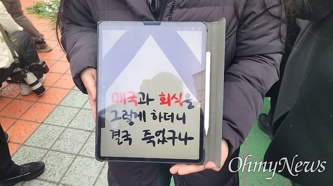 테블릿 PC에 '윤 탄핵 안 해? 액션빔!'이라고 적은 화면을 들고 있던 한 20대 여성 대학생은 "촛불집회에서 진화한 응원봉 집회도, 오늘의 장례식도, 자발적이기 때문에 새로운 것 아닐까요"라고 웃었다.