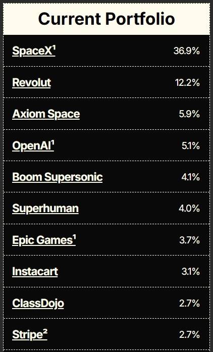스페이스X가 36.9%로 가장 비중이 크며, 다음으로는 비중 12.2%로 영국계 핀테크 기업 리볼트(Revolut)가 자리했다.