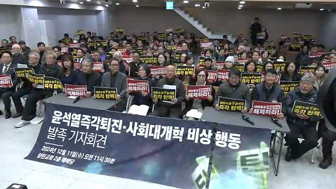 민주노총과 민주사회를위한변호사모임 등 전국 1천5백여 개 시민단체로 이뤄진 '윤석열 즉각 퇴진·사회대개혁 비상행동'이 오늘 서울 종로 향린교회에서 기자회견을 갖고 출범을 알렸습니다.