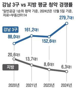 반면 서울을 제외한 지방의 청약 경쟁률은 6.29대1로 2013년(2.11대1) 이후 최저치를 기록했다. 올해 6만295가구가 공급된 지방 일반분양에 참가한 1순위 청약 건수는 37만9168건으로 이 역시 2013년 이후 최저치다. 이러한 극명한 대비는 청약시장의 심각한 양극화 현상을 여실히 보여준다.
