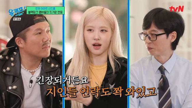 유재석은 "블랙핑크 멤버들이 그리울 때도 있나"라고 물었다. 로제는 "많다"라며 "'아파트' 노래 나오던 날도 첫날 성적을 기다리고 있는데 리사랑 한 시간 넘게 영상통화를 했다. 라면 끓여 먹으면서 얘기했다. 리사는 뉴욕에 있었다"라고 말했다.