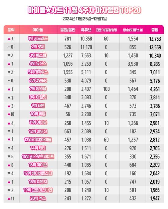 지드래곤부터 임영웅까지, 아이돌차트 11월 4주 차 아차랭킹 TOP10 눈길