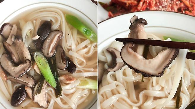 표고버섯만으로 감칠맛을 끌어내면 어떤 종류의 시원함을 내뿜는지 제대로 확인해 볼 수 있는 요리. 소금과 간장만으로도 충분히 시원한 국물을 만들 수 있고, 약간의 조미료를 넣어주면 밖에서 사 먹는 칼국수의 맛도 느낄 수 있다. 요즘처럼 눈 쌓인 풍경을 보면서 후- 후- 불어가며 먹기 최고인 표고버섯 칼국수.