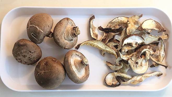 말린 표고버섯은 물에 우리는 작업을 선행해야 한다. 이렇게 하면 채수까지 덤으로 얻을 수 있어서 요리 결과물이 훨씬 좋아진다. 점점 생채소의 폭이 좁아지는 겨울에 들어가면, 나는 말린 표고버섯으로 버섯 밥을 해 먹는다. 찹쌀을 20% 정도 넣어 깨끗하게 씻은 쌀에 불어난 표고버섯, 다시마 한 조각, 들기름 한 스푼을 넣고 표고버섯 우린 물을 넣어 전기밥솥으로 밥을 한다. (당연히 뚝배기나 솥으로 만들면 훨씬 맛있다.) 김이 모락모락, 광택이 나는 버섯 밥에 간장 양념장을 조금씩 섞어 곱창 김을 싸 먹으면 겨울의 매서운 추위도 이겨낼 수 있을 것 같은 힘이 생긴다. 생으로 먹을 때는 맛의 즐거움을, 말린 표고버섯은 요리의 풍미를 더해주는 든든한 지원군으로. 표고버섯에 기대어 1년을 살아간다.