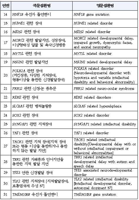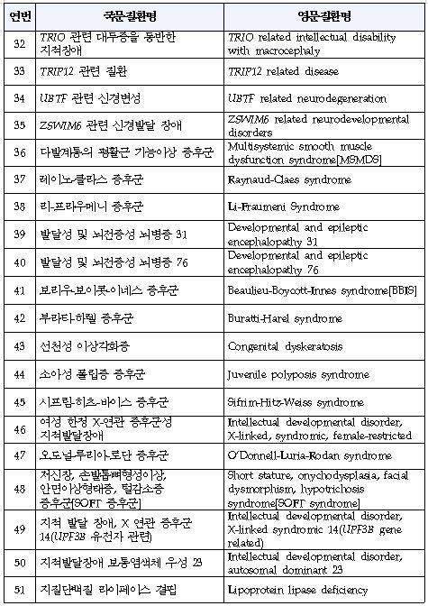 이완불능증, 손발바닥농포증 등 2개 희귀질환과 선천성 이상각화증 등 59개 극희귀질환, 기타염색체이상질환 5개 등 총 66개 희귀질환이 신규 산정특례 적용 대상이 된다.