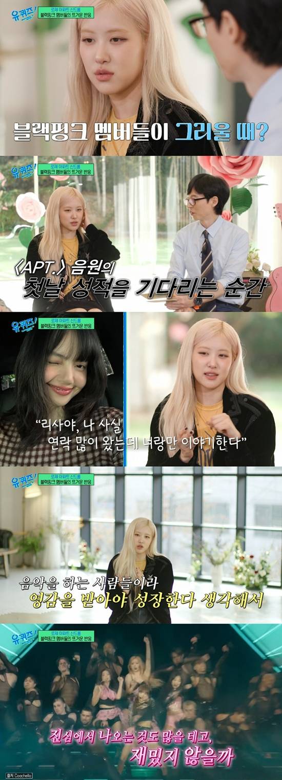 로제는 "많다"면서 "'아파트(APT.)' 나온 날 긴장됐다. 지인들 연락도 와있고 결과를 기다리고 있는데 리사 연락이 와서 한 시간 넘게 영상 통화를 했다. 서로 뉴욕에 있었는데 라면 끓여 먹으면서 '사실 연락 많이 왔는데 너랑만 이야기한다'고 했다. 지수 언니랑도 통화할 수 있는데 굳이 문자 1시간 한 적도 많고 제니 언니도 주변에서 '아파트' 노래 나오고 있으면 영상 보내준다. 연락 자주한다. 다들 워낙 바쁘게 살고 있어서 그립다"고 이야기했다.
