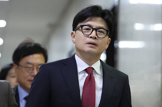[국민의힘 한동훈 대표가 12일 오전 서울 여의도 국회에서 열린 비공개 최고위원회의에 참석하고 있다. (사진=연합뉴스)]