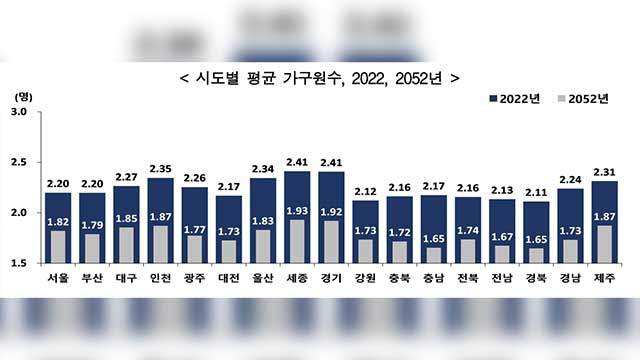 2022년에는 전국 17개 시·도의 평균 가구원 수가 최고 2.41명(세종·경기)에서 최저 2.11명(경북) 수준인데, 2052년에는 세종(1.93명)과 경기(1.92명)를 제외한 다른 시·도의 평균 가구원 수는 1.9명을 밑돌 것으로 전망됐습니다.